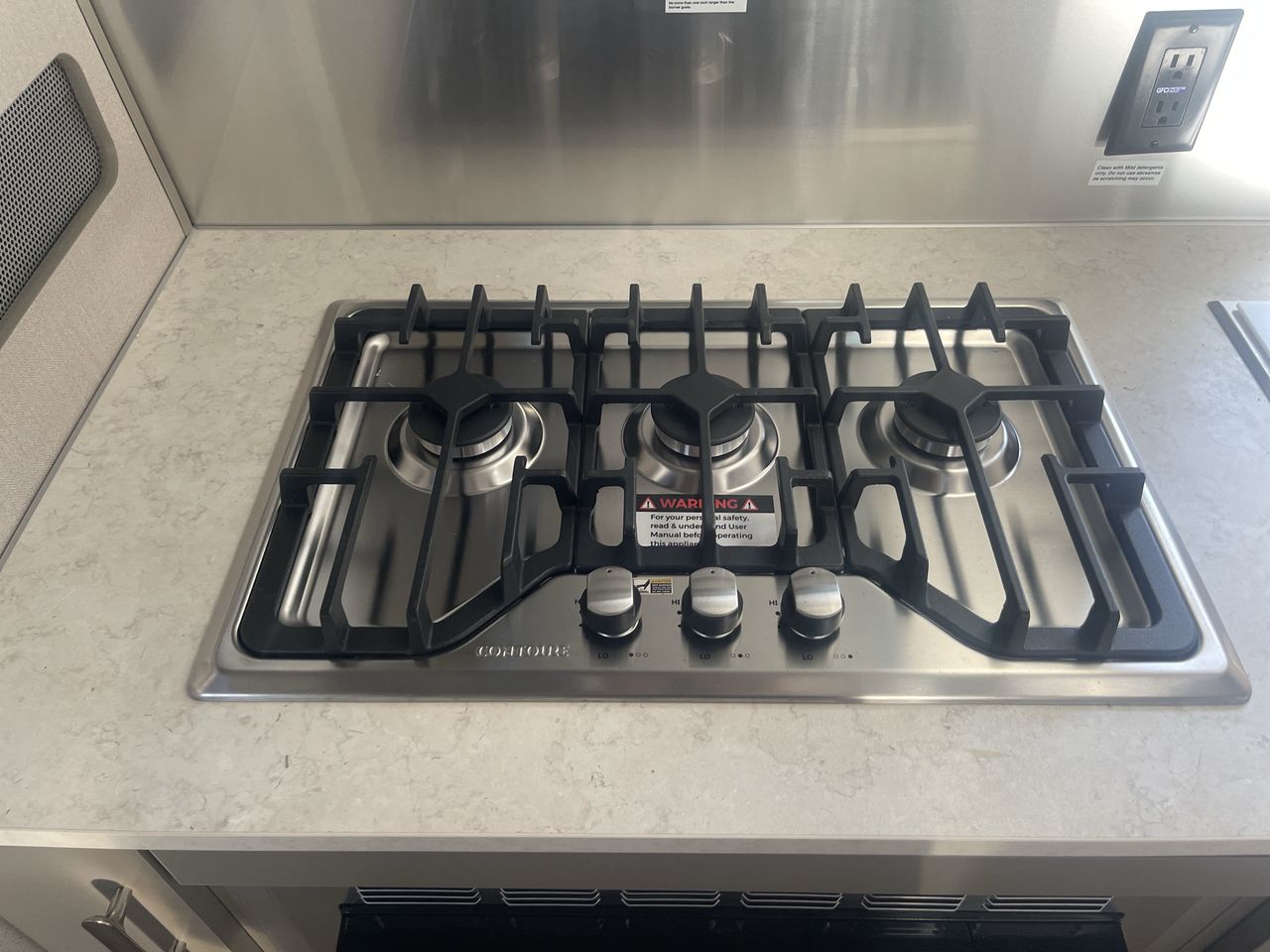 The central living area includes a U-shaped dinette that converts into an additional sleeping space, accommodating up to four people in total. The kitchen is equipped with a three-burner gas stove, convection microwave, compact refrigerator, and ample counter space, making meal preparation convenient.