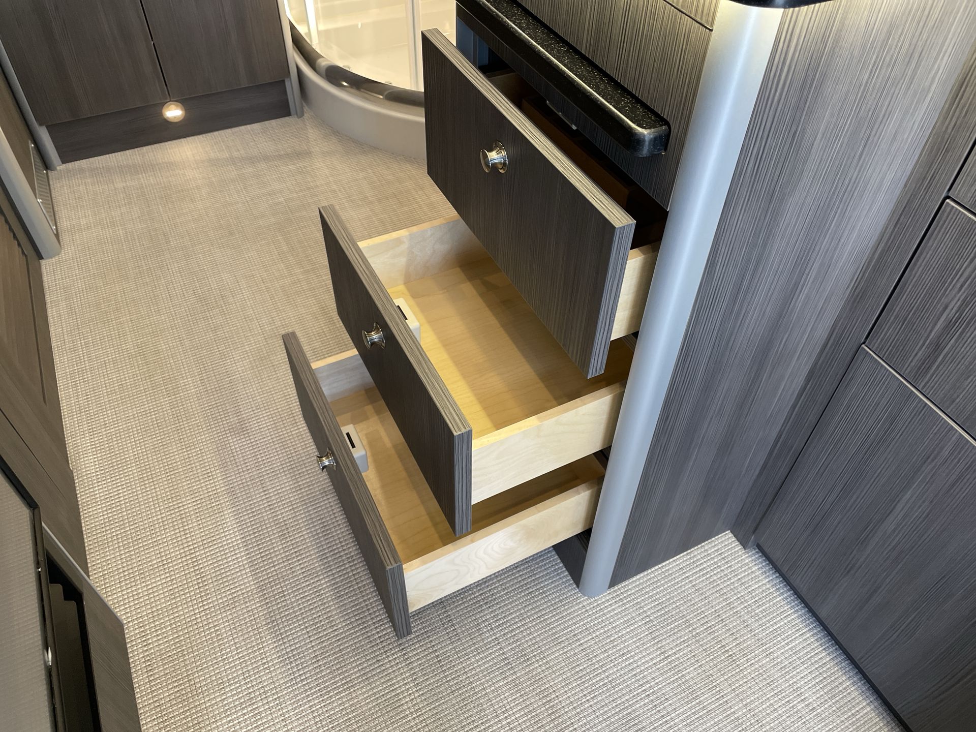 Inside the Murphy Suite, the innovative design maximizes space without compromising on luxury. The powered slide-out transforms the lounge area into a spacious living space. During the day, relax on the plush reclining sofa with two power seats. At night, the Murphy bed conveniently folds down, creating a cozy sleeping area without occupying additional space. This smart use of space makes the Atlas ideal for couples or solo travelers who value versatility.