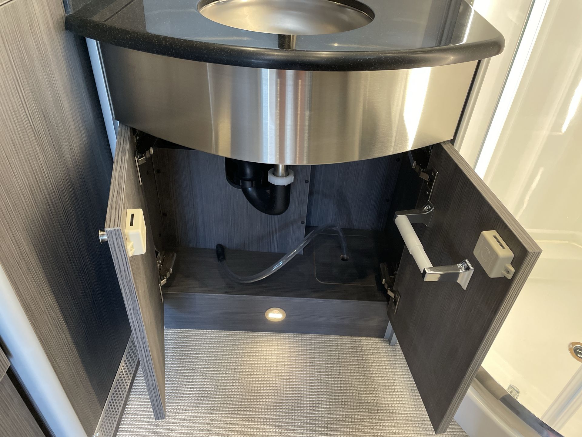 The kitchen is equipped with high-end appliances, including a two-burner gas stove, a convection microwave oven, and a mid-size refrigerator with a freezer. Solid-surface countertops, a large stainless steel Kohler® sink, and a slide-out pantry enhance both functionality and style, making it easy to prepare homemade meals on the road.