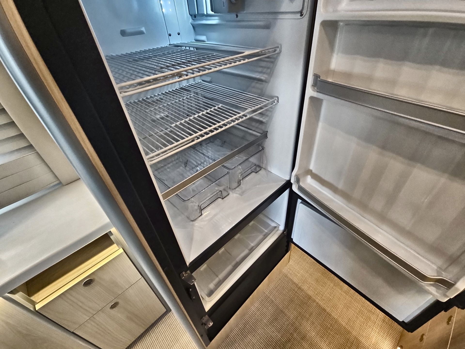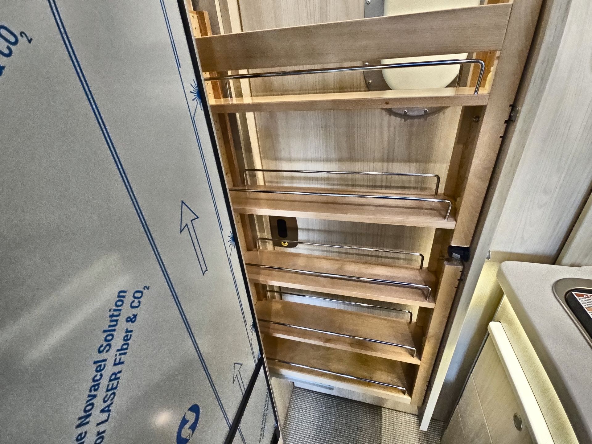 The kitchen is equipped with high-end appliances, including a two-burner gas stove, a convection microwave oven, and a mid-size refrigerator with a freezer. Solid-surface countertops, a large stainless steel Kohler® sink, and a slide-out pantry enhance both functionality and style, making it easy to prepare homemade meals on the road.