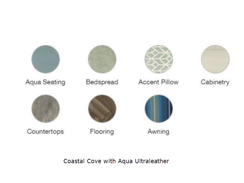 Sleeps 4 Length 23 ft 11 in Ext Width 8 ft Ext Height 9 ft 7 in Int Height 6 ft 6 in Interior Color Coastal Cove with Aqua Ultraleather, Coastal Cove with Seashell Ultraleather Hitch Weight 500 lbs GVWR 6000 lbs Dry Weight 5100 lbs Cargo Capacity 900 lbs Fresh Water Capacity 37 gals Grey Water Capacity 37 gals Black Water Capacity 17 gals Tire Size ST225/75R15 Furnace BTU 18000 btu Available Beds RV Queen Refrigerator Type 12V Electric w/Freezer Refrigerator Size 6.8 cu ft Cooktop Burners 3 Number of Awnings 1 LP Tank Capacity 30 lbs Water Heater Type Tankless On Demand LP AC BTU 13500 btu TV Info LR 24" 12V DC Smart TV, BR 24" 12V DC Smart TV Awning Info Powered Zipdee with Sunbrella Fabric; Rear & Roadside Window Awnings Axle Count 2 Number of LP Tanks 2 Shower Type Standard Electrical Service 30 amp Similar Floorplans