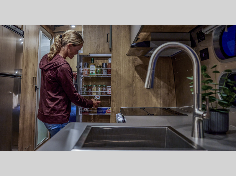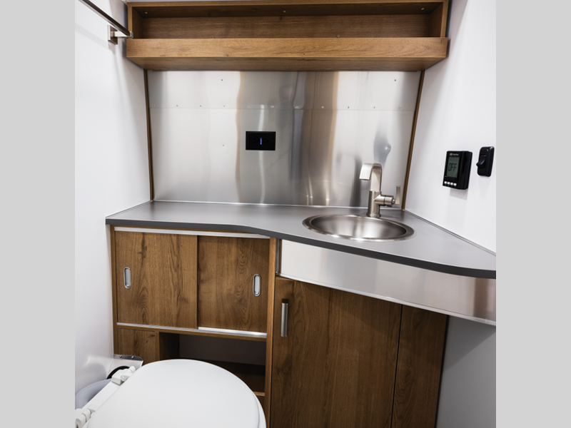 The standard 3" suspension lift kit, rugged tires, and front rock guard will provide smooth towing, whether you're on back roads looking for the perfect place to boondock or cruising the highway! There is a huge internal battery bank with three chassis-integrated 270Ah lithium batteries, a 3000W inverter, and the most solar potential for all your off-grid needs. And we haven't even mentioned the interior luxuries, like the onboard bathroom, versatile sleeping and living areas, ample storage, and functional kitchen!